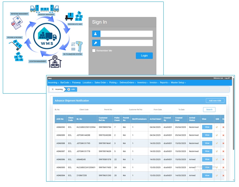 WMS is a warehouse management system developed for Fusionova Technologies Pte Ltd to improve warehouse and distribution operations, integrating with ERP via barcode data. Singapore based service organization
